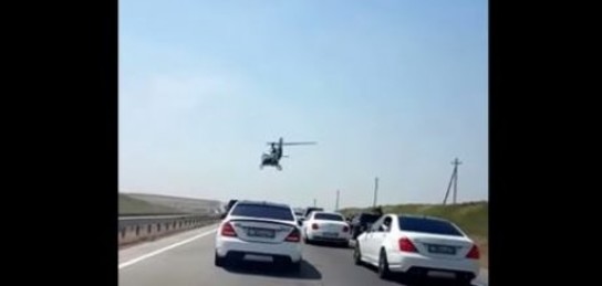 На видео запечатлено, как вертолет красиво летит во главе кортежа, стараясь не обгонять автомобили, но и не отставать.