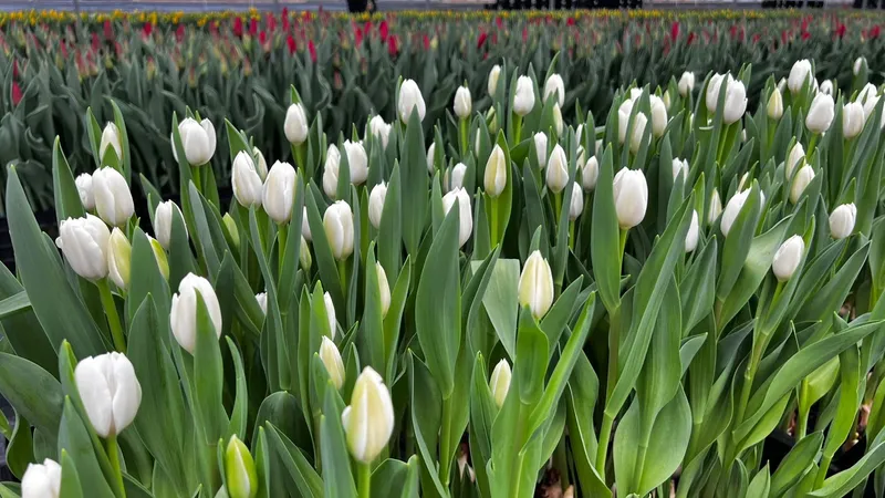 Внутри теплицы – особенная атмосфера. Ряды тюльпанов тянутся до самого конца помещения, словно живой ковер из красных, желтых, белых и фиолетовых оттенков.