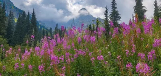 На кадрах– густые заросли ярко-сиреневого Иван-чая на фоне хвойных лесов и скалистых склонов.