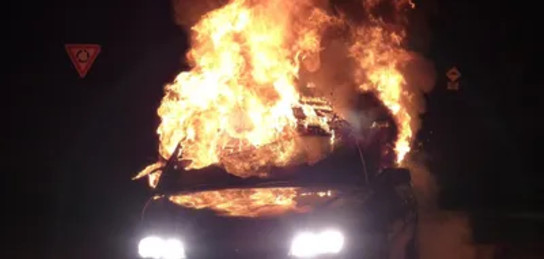 В сети появились кадры, на которых Toyota маневрирует среди других машин, а потом на полном ходу врезается в припаркованный на обочине грузовик. На других кадрах видно, что после столкновения начался пожар.