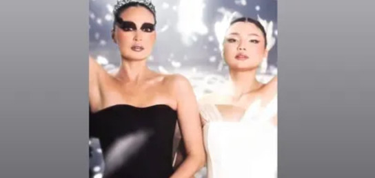 Мать и дочь примерили контрастные амплуа Одетты и Одиллии, воплотив на экране борьбу светлого и темного начал. Атмосферу постановки подчеркнули изысканные наряды и драматичный сценический макияж, в точности передающий стилистику знаменитой киноленты.