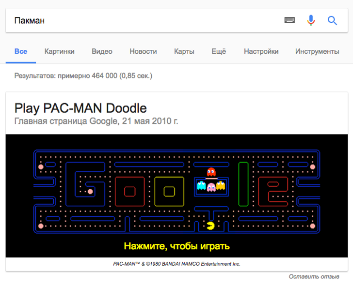В 2010 году в честь 30-летия выхода игры Pac-Man в поисковике появилась интерактивная мини-игра для всех пользователей. Чтобы запустить ее, нужно просто ввести слово "Пакман" в поле поиска.