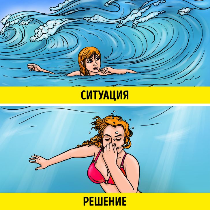 Когда море неспокойно, плавать вообще не рекомендуется, но мало кого это останавливает. Если вы отплыли от берега, а волны оказались такими большими, что накрывают вас с головой, нужно подныривать под волну, зажимая рукой нос. Если попытаетесь бороться с большими волнами, можете наглотаться воды и запаниковать.