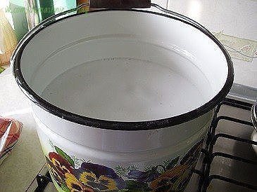 Я эту процедуру проводила в ведре. Наливаем воду в ведро, доводим ее до кипения, в кипящую воду добавляем все компоненты и хорошо размешиваем. Плиту выключаем.