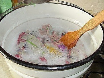 Деревянной лопаткой или любым другим инструментом полностью погружаем в горячий раствор грязные полотенца и салфетки. Погрузили и оставляем все содержимое ведра до полного остывания. Можно ведро закрыть крышкой.