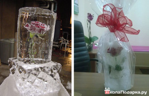 Уложите цветок в емкость, стараясь поместить его в ней как можно более эффектно. Если вы используете стакан, стебель лучше обрезать как можно короче, оставив сам бутон. Придерживая растение, наполняйте стакан водой до тех пор, пока она полностью не покроет головку цветка. Получившуюся заготовку поместите в морозильную камеру, где она должна оставаться несколько часов, до полной заморозки. После этого достаньте свой ледяной подарок из холодильника и очень аккуратно извлеките замерзшую розу из стакана. Ваш удивительный, ни на что не похожий презент любимой девушке, сделанный своими руками, готов!