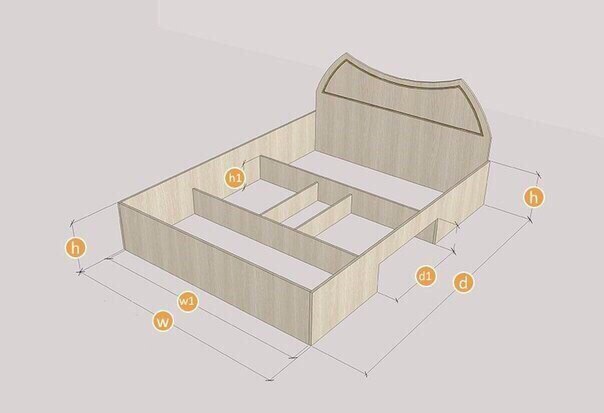 Собрать на конфирматах прямоугольный короб не представляется особой проблемой. Дощечки для этого должны быть такой высоты, чтобы над сеткой образовывался 50–70 мм бортик, ограждающий матрас от соскальзывания. При стандартной высоте мебельных ножек в 250 мм высота декоративного короба составит около 300–350 мм. Длина боковых стенок должна позволять вынести стенки короба назад для более плотного примыкания к стене и скрытия деталей крепления изголовья. Ширина фронтальной стенки, в общем, равна ширине сетки (матраса), хотя рекомендуется сделать небольшой припуск около 5 мм.