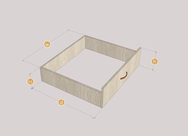 h - высота лицевой панели ящика, оптимальный размер 200 мм. w - ширина ящика, до 700 мм. d - длина (глубина) ящика. h1 - высота основного профиля ящика, лучше принять равной 150 мм
