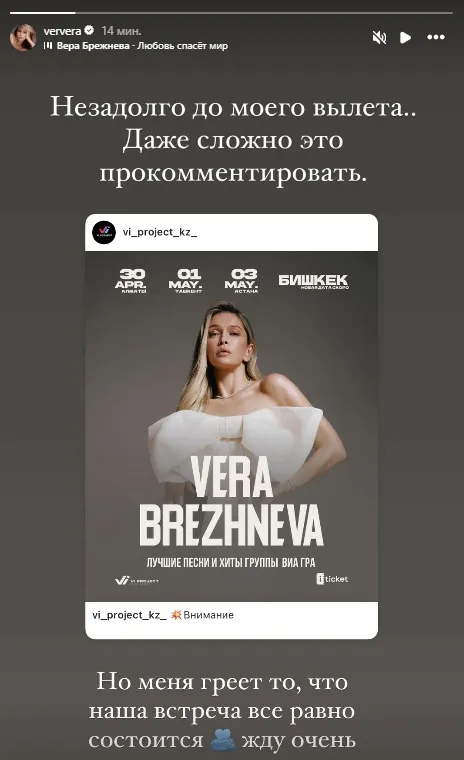 Известная украинская поп-певица, актриса и телеведущая Вера Брежнева, которая 12 февраля 2025 года должна была выступить в Алматы с концертом, вышла на связь с поклонниками в Instagram, сообщает Zakon.kz.