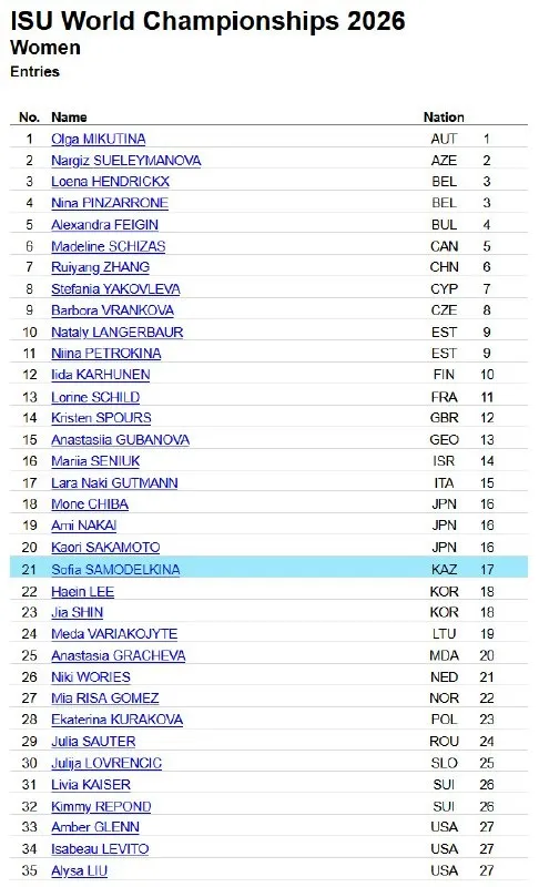 Что касается фигуристок-одиночниц, то здесь ожидаемо заявлена Софья Самоделкина. В остальных видах и других казахстанских фигуристов в заявочных списках нет.