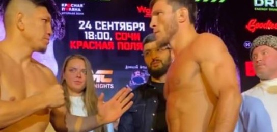 Накануне поединка бойцы прошли взвешивание и встретились лицом к лицу на дуэли взглядов. Видео опубликовано на странице FIGHT NIGHTS GLOBAL в Instagram.