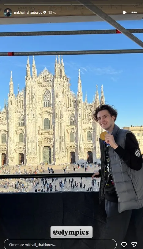 Снимок, сделанный на фоне Миланского собора, 21-летний фигурист из Алматы опубликовал 15 февраля в Instagram-Stories. Первое, что бросается в глаза, – это золотая медаль ОИ, с которой Шайдоров мило позирует на фоне собора, расположенного в историческом центре Милана.
