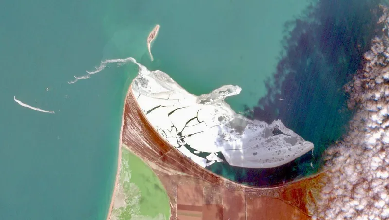В районе Бакальской косы у побережья Крыма в Черном море обнаружено крупное ледяное поле длиной более 7 км. Такие наблюдения удалось получить с помощью спутников дистанционного зондирования, сообщает Zakon.kz.