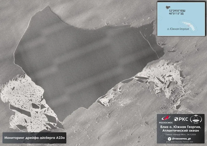 Российский радиолокационный спутник "Кондор-ФКА" снял расколовшийся айсберг А23а, дрейфующий в Атлантическом океане, сообщает Zakon.kz.