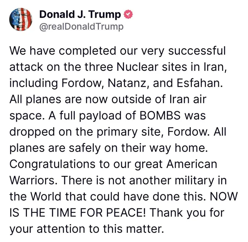 "Мы завершили очень успешную атаку на три ядерных объекта в Иране. Полный груз БОМБ был сброшен на главный объект, Фордо. Все наши самолеты уже покинули иранское воздушное пространство и в безопасности возвращаются домой. Поздравляю наших великих американских воинов! В мире нет другой военной силы, способной сделать такое. ТЕПЕРЬ ВРЕМЯ ЗАКЛЮЧИТЬ МИР! Спасибо за внимание".Дональд Трамп
