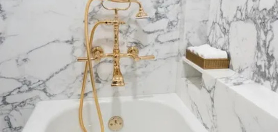 Там, где раньше зеленая плитка ар-деко напоминала о 1940-х годах, теперь сияет черно-белый мрамор, а все смесители – золотые. Над раковиной висит зеркало в тяжелой золотой раме, с потолка свисает люстра. Даже мусорная корзина вычищена до блеска.
