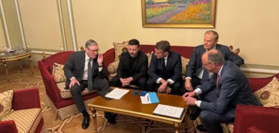 Утром 10 мая в Киев приехали президент Франции Эммануэль Макрон, польский премьер-министр Дональд Туск, канцлер ФРГ Фридрих Мерц и британский премьер Кир Стармер.